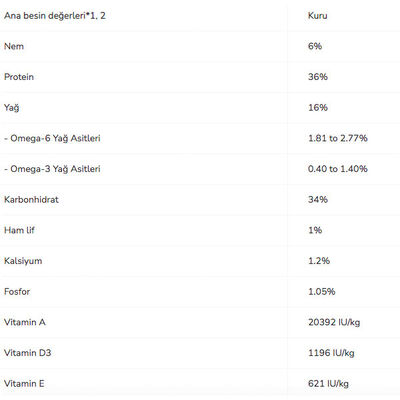 İçerik :Tavuk Eti, Pirinç, Mısır Gluten Unu, Kümes Hayvanları Türevleri Unu, Kurutulmuş Yumurta ürünü, Karışık Tokoferollerle Korunmuş Sığır Yagı, Bugday Unu, Soya Proteini Konsantresi, Balik Unu, Aroma, Tuz, Mineraller, Vitaminler, Taurin