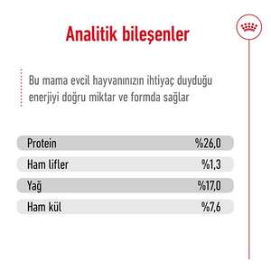 Analitik Bileşenleri:Protein: %26,0 - Yağ: %17,0 - Ham Kül: %6,7 - Ham lifler: %1,3 - Her kg için: Omega 3 yağ asidi: 7,8 g, EPA/DHA dahil: 4 g