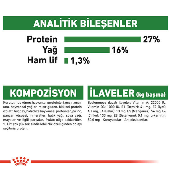 İçerik:kurutulmuş kümes hayvanları proteinleri, mısır, mısır unu, hayvansal yağlar, mısır gluten, bitkisel protein izolat*, buğday, hidrolize hayvansal proteinler, pirinç, pancar küspesi, mineraller, balık yağı, soya yağı, mayalar ve ilgili parçalar, frukto-oligo-sakkaritler.