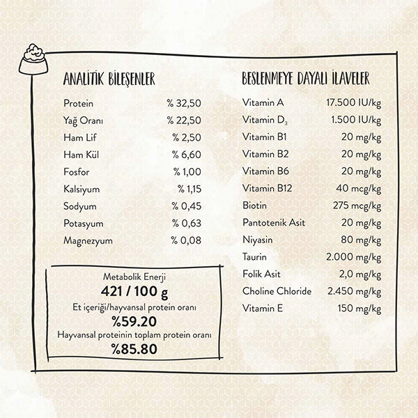 İçeriği:Taze kuzu eti (min.%5), taze kanatlı eti (min.%20), pirinç (min.%14), hayvansal yağ, balık eti, tavuk eti unu, et unu, proteini, sorgun pekmezi, karaciğer (kurutulmuş), hidrolize et, kıkırdaklar (kurutulmuş), yumurta unu (kurutulmuş), keten tohumu, kurutulmuş pancar küspesi (şekersiz), selüloz lifleri, maya (kurutulmuş), balık yağı, potasyum klorür, kızılcık (kurutulmuş), yaban mersini (kurutulmuş), midye tozu(NZ) yeşil dudaklı midye özü (besinsel kıkırdak oluşumu ve fonksiyonu destekler), hindiba, kadife çiçeği (kurutulmuş) yucca özü.