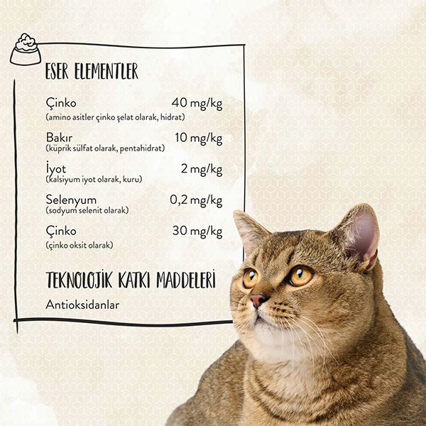 Glutensiz formülü ile hassas sindirim sistemine sahip kediler için de uygundur. İçerdiği vitamin ve mineraller, kedinizin bağışıklık sistemini güçlendirirken; doğal lif kaynakları sindirimi kolaylaştırır. Ayrıca eklem sağlığını destekleyen glukozamin ve bağışıklığı güçlendiren mannan ve beta-glukan kompleksleri ile kedinizin sağlıklı ve enerjik bir yaşam sürmesine yardımcı olur.