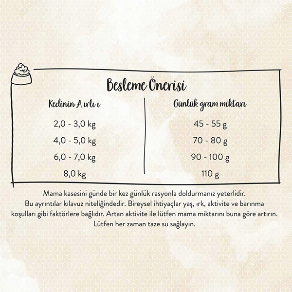 Sanabelle Glutensiz Indoor Kedi Maması, kedinizin yaşına, kilosuna ve aktivite seviyesine göre porsiyonlanmalıdır. Ortalama bir yetişkin kedi için günlük 50-70 gram mama önerilmektedir. Mama kuru olarak servis edilmeli ve yanında her zaman taze su bulundurulmalıdır. Yeni mama geçişlerinde mevcut mama ile karıştırarak 7-10 gün içerisinde kademeli geçiş yapılması tavsiye edilir.