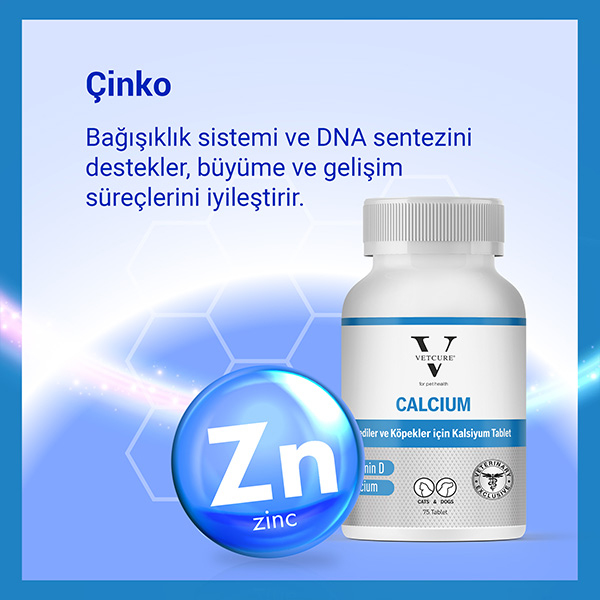 Vetcure Calcium, özellikle gelişim dönemindeki yavru hayvanlar, yaşlı bireyler veya kalsiyum ihtiyacının arttığı özel dönemlerdeki kedi ve köpekler için geliştirilmiş veteriner destekli bir mineral destek tabletidir. Yüksek oranda kalsiyum, magnezyum ve çinko ile kemik gelişimini, kas fonksiyonlarını ve diş sağlığını destekler. C vitamini ilavesiyle bağ dokularının güçlenmesine ve kalsiyum emilimine katkı sağlar.