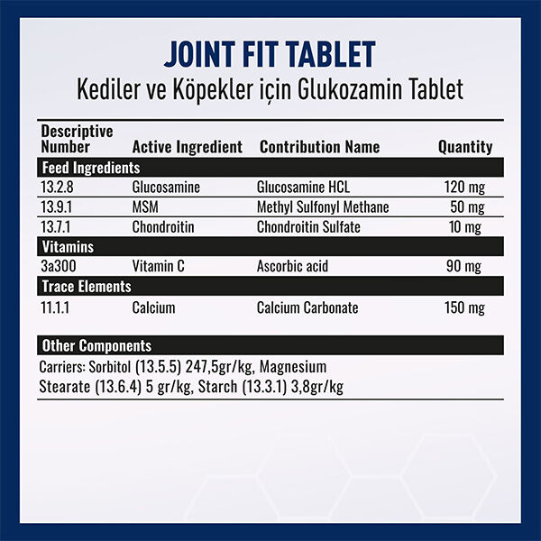 Vetcure Joint Fit Tablet, yaşlanma, yoğun aktivite ya da ırksal yatkınlık nedeniyle eklem, kas ve hareket kısıtlılığı yaşayan köpekler için geliştirilmiş fonksiyonel, veteriner destekli bir takviye formülüdür. Glukozamin, MSM, kondroitin ve C vitamini içeriğiyle eklem kıkırdağını desteklerken, kalsiyum ile kas ve kemik yapısını dengeler. Her tablet, uzun vadeli hareket kabiliyetini korumaya yardımcı olacak şekilde yüksek biyoyararlanımlı olarak formüle edilmiştir.