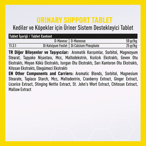 Vetcure Urinary Tablet, sık tekrarlayan sistit, idrar yollarında kristal veya taş oluşumu gibi problemlere yatkın köpekler için geliştirilmiş veteriner destekli bir idrar yolu sağlığı takviyesidir. Formülündeki yüksek oranlı D-Mannoz, bakterilerin mesane duvarına tutunmasını önlerken; kızılcık, geven, meyan kökü, sarı kantaron ve ısırgan otu gibi güçlü bitkisel bileşenlerle desteklenmiş yapısı, hem akut hem de kronik durumlarda doğal koruma sunar.